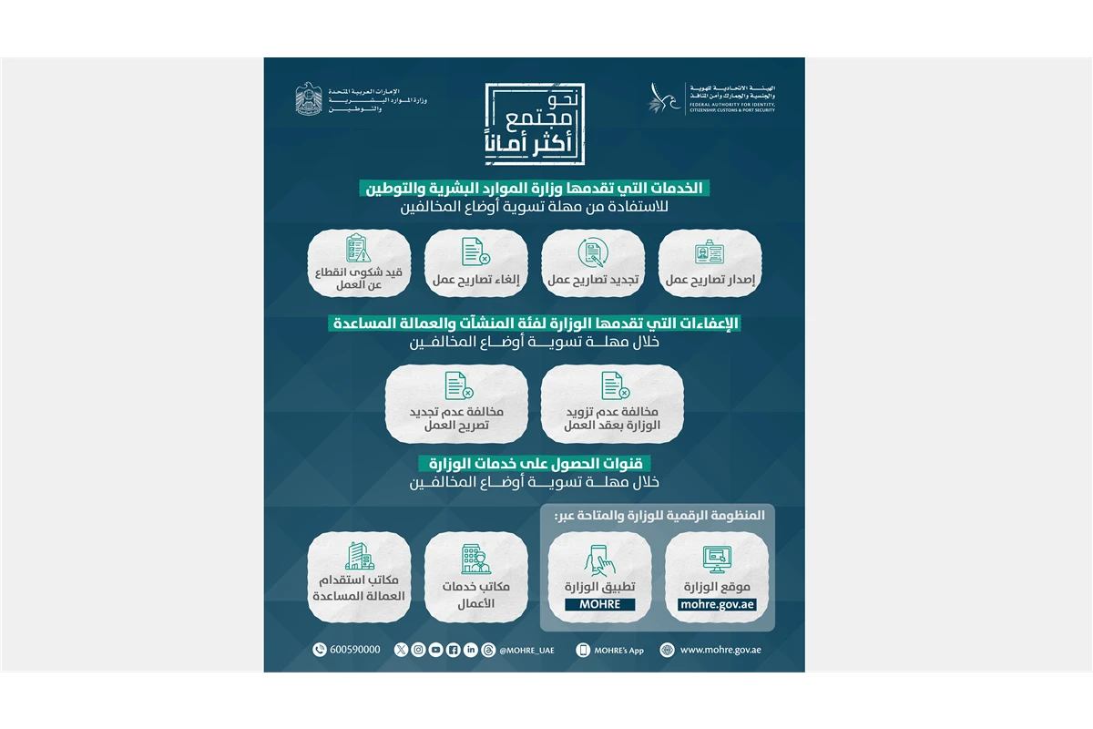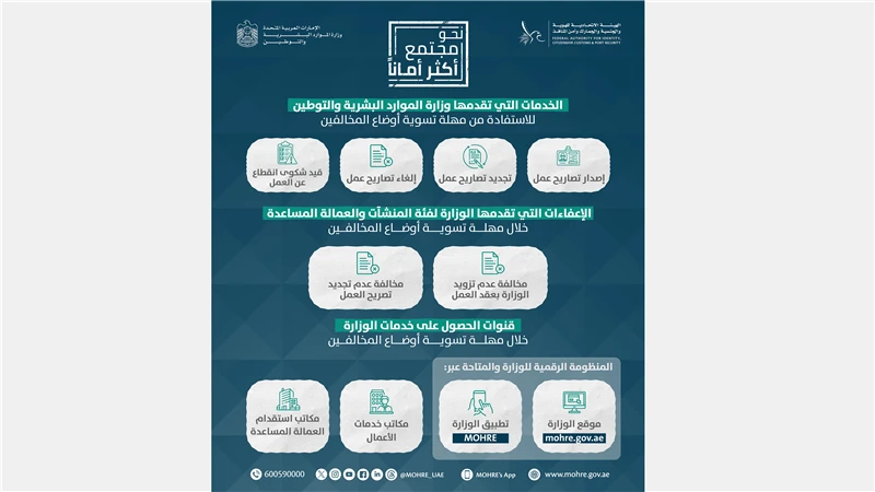 أعلنت وزارة الموارد البشرية والتوطين عن توفير أربع خدمات لتصحيح أوضاع العمالة المخالفة واعفاء المنشآت من غرامات إدارية، وذلك خلال مهلة تسوية أوضاع المخالفين التي دخلت حيز التنفيذ اعتبارا من الأول من شهر سبتمبر الجاري وتستمر حتى 31 أكتوبر المقبل بالتعاون مع الهيئة الاتحادية للهوية والجنسية والجمارك وأمن المنافذ تحت شعار "نحو مجتمع أكثر امانا " وذلك لمن ترتبت عليهم المخالفات قبل 1 سبتمبر 2024.