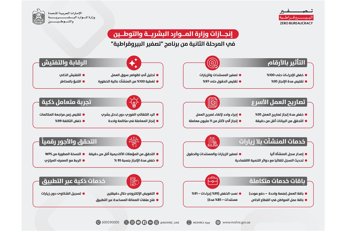 وأوضح سعادة راشد السعدي وكيل الوزارة المساعد لخدمات سوق العمل بالإنابة، ان فرق الوزارة حققت قفزات نوعية في برنامج تصفير البيروقراطية خلال مدة قياسية نتج عنها مزيداً من الشمولية والابتكار في طريقة ومستوى تقديم الخدمة للمتعاملين لتعزيز تجربتهم ودعم ريادة الخدمات الحكومية في الدولة، وترسخ مكانتها كأفضل مكان للعيش والاستثمار والعمل في العالم.
