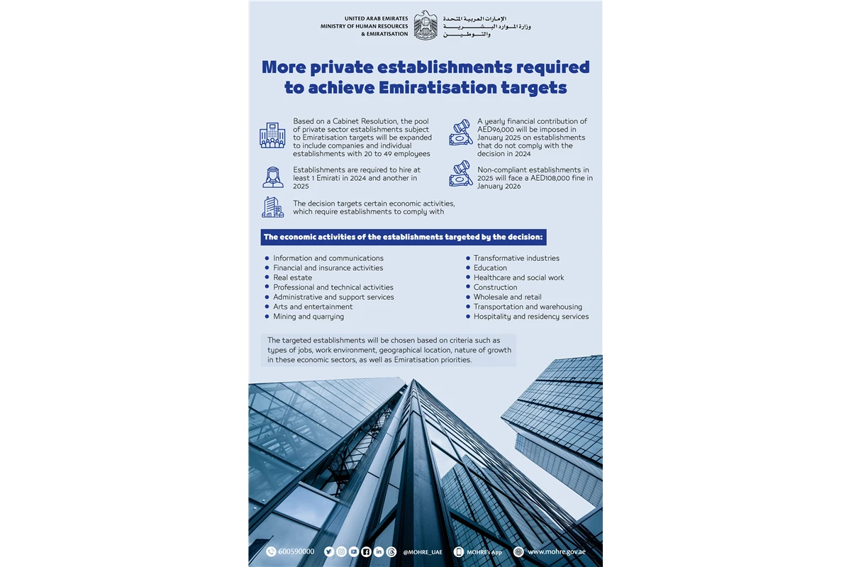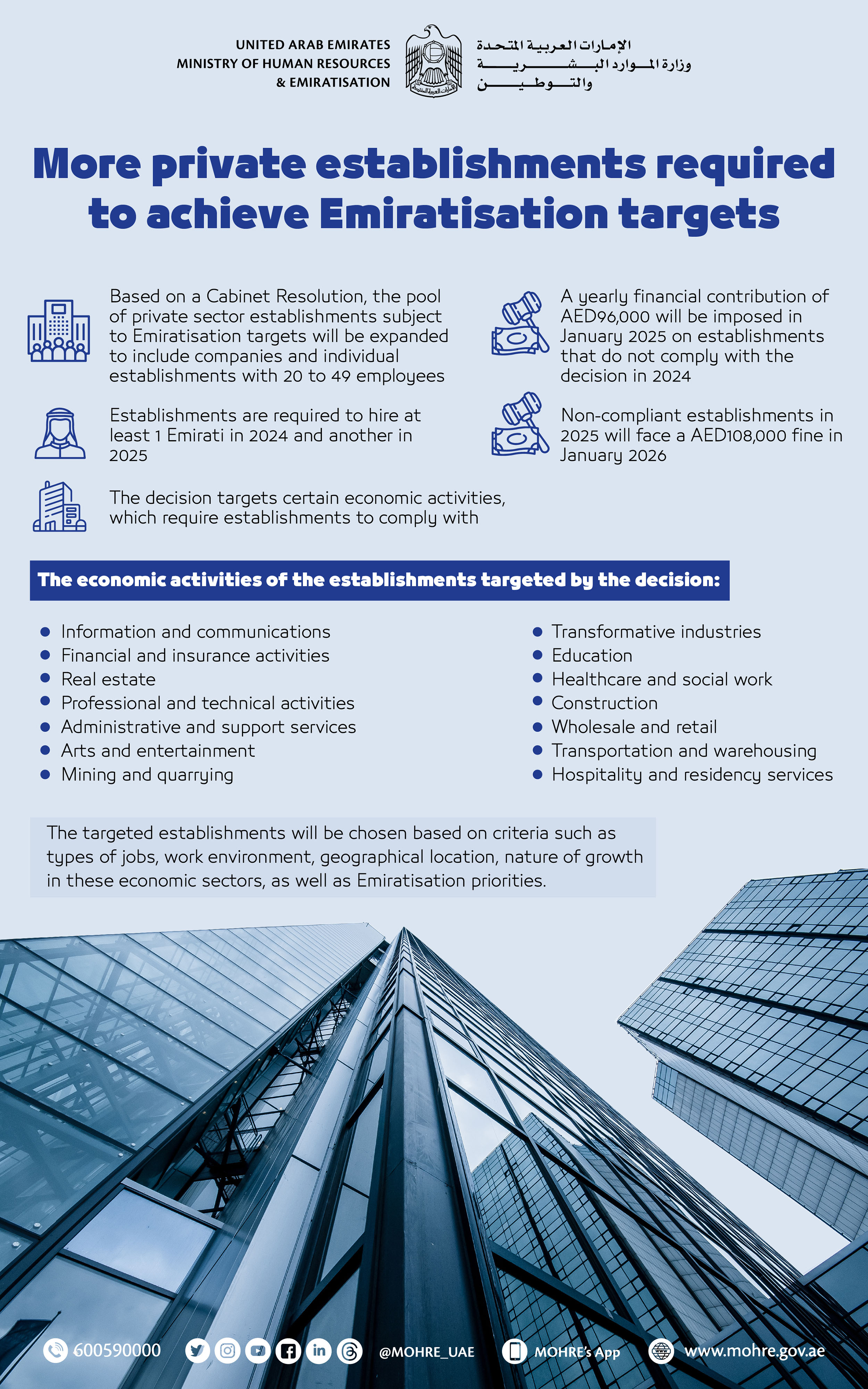 In implementation of a UAE Cabinet Resolution, the pool of private sector establishments subject to Emiratisation targets will be expanded to include companies and individual establishments with 20 to 49 employees in specific economic activities, the Ministry of Human Resources and Emiratisation (MoHRE) announced on Monday.